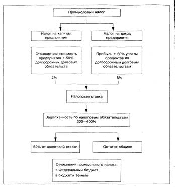 Основой расчета налогов на доход и капитал предприятия является налоговая ставка. Она состоит из 5% дохода предприятия и 2% капитала предприятия (малые предприятия освобождаются от уплаты). На основе этих ставок общины применяют для расчета задолженности по налоговым обязательствам свои действующие в данное время налоговые ставки, которые, как правило, находятся в пределах между 300 и 400%. Поступления от промыслового налога в 1990 г. составили сумму около 39 млрд. марок; при этом 52% суммы, рассчитанной по основной налоговой ставке, общины должны при всех условиях перечислить в федеральный и местные бюджеты (1990 г. — 5,6 млрд. марок). И все же промысловый налог — важнейший налоговый источник для общины. Налог на капитал предприятия, как и налог на основные и оборотные фонды предприятия (поимущественный налог), взимается с капитала (имущества) предприятия: оба эти налога должны уплачиваться даже тогда, когда прибыли нет. Следовательно, для предприятий, находящихся в фазе убытков, эти налоги представляют дополнительную тяжелую налоговую нагрузку, поэтому в новых немецких землях они не взимаются.