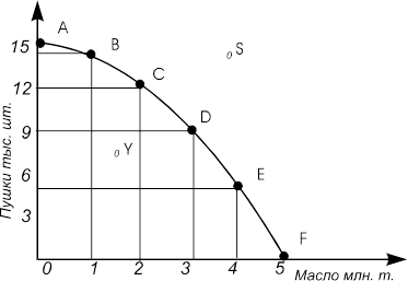 Допустим, необходимо произвести два товара — пушки и масло. Эти товары, как правило, используют для иллюстрации альтернативности гражданского и военного производства. Например, абсолютно все ресурсы общества направлены на производство масла. Будем считать объем его в 5 млн. кг - это максимум, который возможно произвести при данном уровне ресурсно-технологического обеспечения. Альтернатива «масляному раю» — пушечный производство при том же ресурсно-технологическом значении, которое может составить максимально 15 тыс. шт.