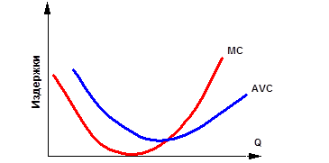 Рассмотрим взаимосвязь общих TC, средних AVC и предельных MC издержек. Для этого дополним рис. 2 кривой предельных издержек и совместим его с рис. 1 в одной плоскости (рис. 4). Анализ конфигурации кривых позволяет сделать следующие выводы о том, что: