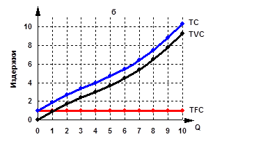 Сумма постоянных и переменных издержек при каждом данном объёме производства образует общие издержки TC. Из графика видно, что для получения кривой общих издержек сумму постоянных издержек TFC необходимо прибавить к сумме переменных издержек TVC (рис. 1).