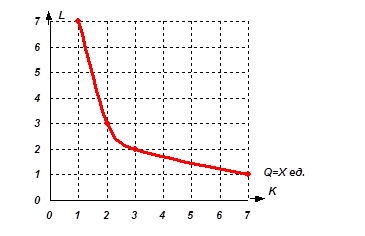 Предположим, что фирма использует два переменных фактора - труд и капитал. Цена единицы труда PL составляет 2 денежные единицы, цена единицы капитала PK - 3 денежные единицы. Заданный объём выпуска достигается путём применения таких комбинаций производственных факторов, как 7L и 1K, 3L и 2K, 2L и 3K, 1L и 7K. На основании приведенных данных построим изокванту выпуска X единиц продукции (рис. 5).