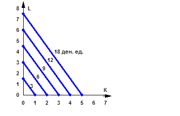 Далее будем рассуждать так: если предприниматель имеет только 3 денежные единицы, то он может приобрести только 1 единицу капитала. Обозначим соответствующие точки на осях абсцисс и ординат и соединим их прямой. Получится изокоста (изокоста значит "равные издержки") 3 денежных единиц. Изокоста - это прямая, каждая точка которой показывает различные комбинации вовлекаемых в производство двух переменных факторов при одинаковых издержках на их приобретение. Аналогичным образом построим изокосты 6, 9, 12 и 18 денежных единиц. Получится карта изокост (рис. 6).