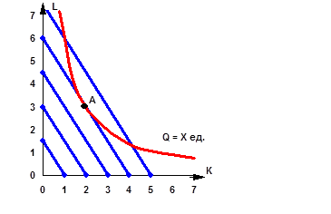 А теперь совместим изокванту выпуска X единиц продукции с картой изокост. На рис. 7 видно, что изокванта в точке A касается изокосты 12 денежных единиц. Это значит, что затраты предпринимателя на приобретение производственных факторов будут минимальными при условии, что он приобретает 3 единицы труда и 2 единицы капитала: (2 ден. ед.×3)+(3 ден. ед.×2)=12 ден. единиц. Это самое оптимальное сочетание применяемых факторов производства для минимизации издержек на их приобретение. Всякая иная их комбинация (7L и 1K, 2L и 3K, 1L и 7K) обойдётся предпринимателю дороже.