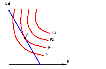 Если данная комбинация применяемых факторов (3L и 2K) минимизирует издержки при заданном объёме производства при данной сумме издержек. Из рис. 8 видно, что для максимизации объёма выпуска фирма применяет комбинацию факторов, соответствующую точке A. Фирма не в состоянии осуществлять объём выпуска, соответствующий изокванте P2 , а тем более P3 , ибо последние ни в одной точке не соприкасаются с изокостой. Для перехода на более высокие изокванты фирме необходимы дополнительные производственные факторы (труд и капитал).