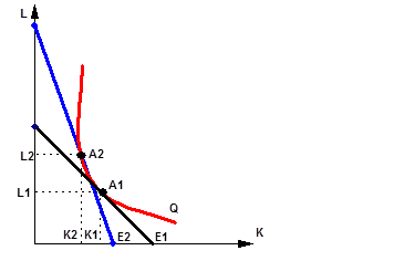 Чтобы сохранить прежний объём выпуска (остаться на прежней изокванте Q), фирме необходимо осуществить технологическую замену капитала трудом. Угол наклона изокосты увеличится, и она примет положение E2 . Теперь фирма будет минимизировать свои издержки в точке A2 , применяя K2 единиц капитала и L2 единиц труда.