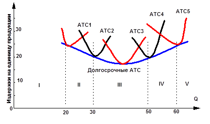 На рис. 10 представлены пять различных вариантов (I-V) размеров предприятия, рассчитанных на производство различных объёмов продукции при наименьших средних издержках ATC. Эти варианты фирма может рассматривать как ступени своего роста. На каких-то промежутках (ступенях) своей деятельности она не меняет своих производственных мощностей, а использует то, что имеется, т.е. можно полагать, что на каждой ступени фирма функционирует в краткосрочном периоде. Поэтому кривая, описывающая её издержки на данном этапе, будет кривой краткосрочных средних общих издержек.
