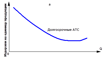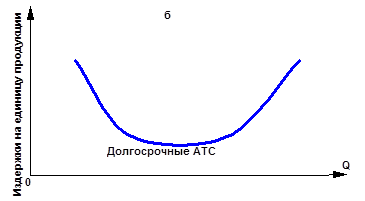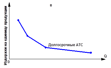 Из рис. 12, в видно, что кривая долгосрочных ATC сначала стремительно падает, затем темп падения замедляется и она плавно снижается с увеличением объёма выпуска. Средние издержки приближаются к постоянным. Такие кривые называются ещё L-образными кривыми.