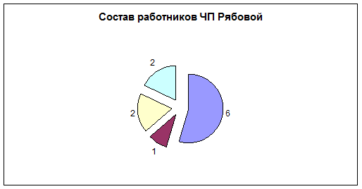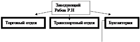 Из рисунка видно , что основную массу работающих составляют продавцы 6 человек, товароведов – экспедиторов 2человека , водителей –грузчиков 2 человека и один бухгалтер. Также еще с 1998 года был официальный заведующий до 2000 года после увольнения по собственному желанию не кто на эту должность не претендовал. В роле исполняющего заведующего является сын Рябовой Р.Н но он не входит в структуру так как не получает официально заработную плату и не состоит в штате, частенько заменяет ЧП Рябову.