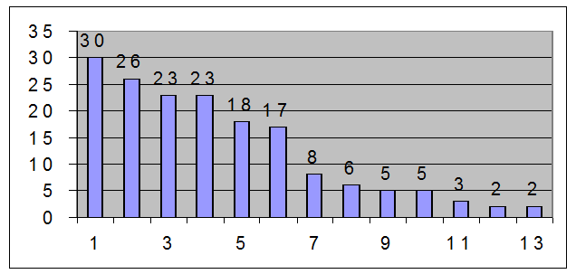 Рис. 1 – Планы МСБ Беларуси на ближайшее будущее (% опрошенных). 1 – поиск новых покупателей; 2 – расширение бизнеса; 3 – сохранение достигнутого; 4 –внедрение новых технологий и улучшение качества товаров; 5 – поиск новых иностранных поставщиков; 6 – поиск новых рынков; 7 – открытие филиала; 8 – приобретение недвижимости в процессе приватизации; 9 – открытие предприятия; 10 – открытие предприятия за границей; 11 – инвестировать за границу; 12 – продать предприятие; 13 – изменить сферу деятельности бизнеса.