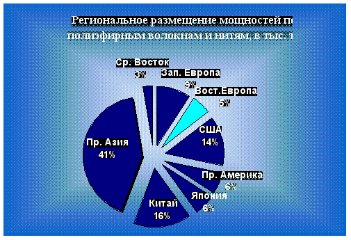 Мощности по полиамидным нитям в мире составляют в настоящее время 4,75 млн. тонн, и регионально размещены в следующем соотношении (рис.3.10):