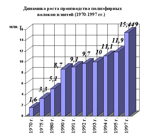 Недостатком полиэфирных волокон, как впрочем, и других синтетических является плохая смачиваемость водой, из-за чего влага трудно проникает из-под одежного пространства во внешнюю среду, в результате чего происходит перегрев тела и, как следствие, появляется дискомфорт. Поэтому применение полиэфирных волокон в производстве нательной одежды ограничено. Выше приводился прогноз о динамике мирового производства химических волокон до 2000 г., однако ещё к концу 1997 г. мировая мощность по полиэфирным волокнам превысила 15 млн. тонн. За 27 лет выпуск полиэфирных нитей и волокон увеличился в 9,65 раз (это видно из диаграммы на рис3.6):