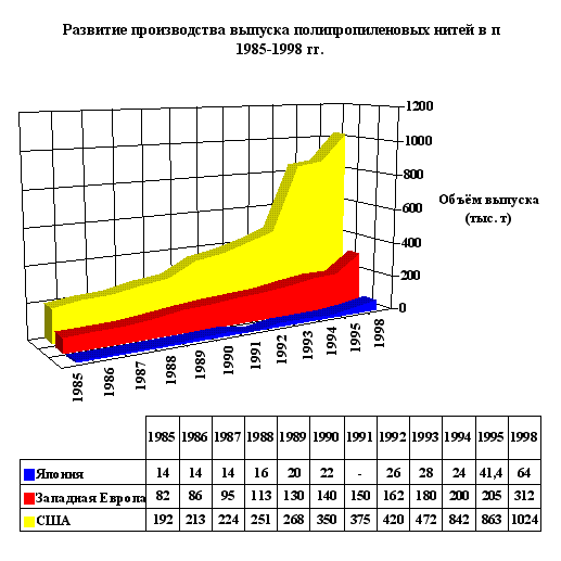 Промышленное производство полипропиленовых волокон и нитей по-прежнему концентрируется в Западной Европе, США и Японии, на которые приходится 70 % всего выпуска ПП. В 90-е годы их доля начала снижаться в связи с созданием производства в развивающихся странах Южной Америки, Азии и Африки. Поэтому динамику развития этих волокон проследим на примере Западной Европы, США и Японии.