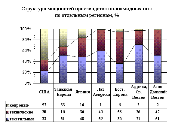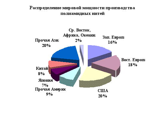 Около 1,5 млн. тонн составляют мощности по техническим нитям. Преимущественное развитие они получили в Восточной Европе, которая занимает 34% мировых мощностей, и в Азии – 23%. В промышленно развитых странах мощности по полиамидным техническим нитям значительно ниже, так как в этих регионах активно развивались полиэфирные технические нити. Доля США в мировых мощностях по полиамидным техническим нитям составляет 16%, Японии – 10% и Западной Европы – 8%. По прогнозу к 2000 году мощности по этому виду полиамидных нитей в мире увеличатся на 17%, причём только за счёт азиатского региона (Китая, Тайваня, Кореи, Индии, Индонезии, Таиланда) и будут в 1,5 раза превышать мощности по полиэфирным техническим нитям.