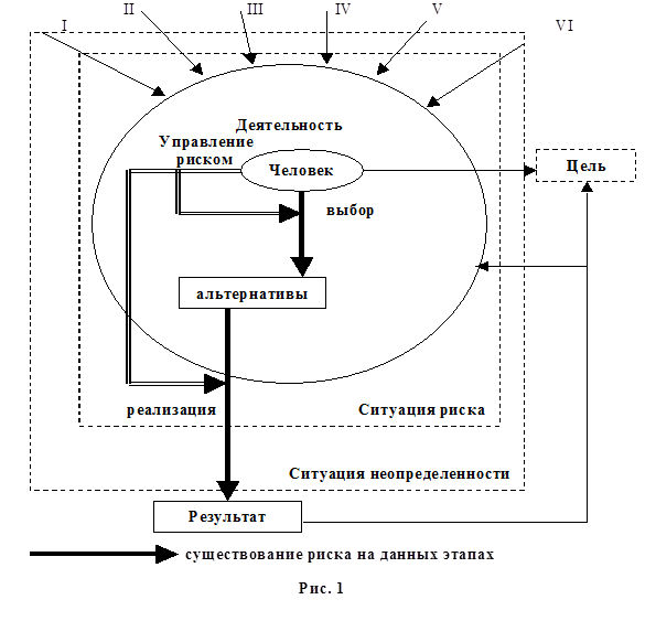 Помимо самого человека на его деятельность влияют факторы I, II, III, IV, V, VI, создающие в ней ситуации неопределенности и риска. Действия и решения человека могут повлиять как в лучшую сторону на результаты деятельности, так и в худшую, разрядить ситуацию неопределенности, изменить цель проекта. Риск существует как на этапе выбора действий (принятия решений), так и на этапе реализации проекта.