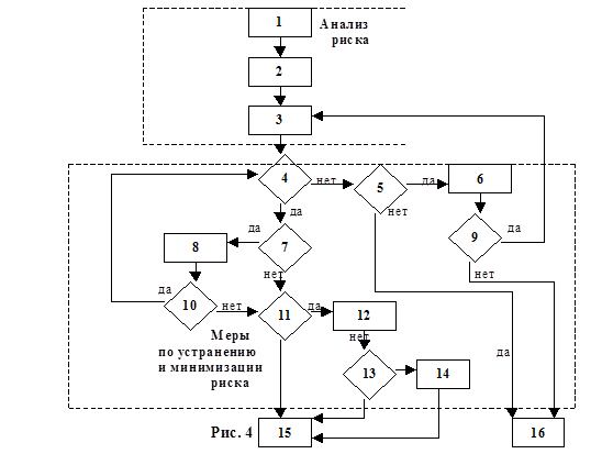На рисунке упрощенной блок-схемы сбор и обработка информации по аспектам риска представления в качестве первого этапа. В действительности эта работа осуществляется на протяжении всего процесса принятия решения. По мере перехода от одного этапа к другому при необходимости может уточняться потребность в дополнительной информации, осуществляется ее сбор и обработка. Т.е. результаты выполненных работ предшествующих этапов служат, как правило, исходной информацией, необходимой для выполнения последующих этапов.