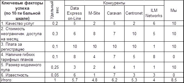 Для сравнения: самые "скоростные" провайдеры обеспечивают скорость примерно на уровне 2,5-5,5 Кбайт/сек (это крупные компании, а также некоторые из наших возможных конкурентов - Data Express on-Line, Caravan, ILM Network (у последних правда это временное или непостоянное явление, характерное только лишь для начальной стадии их деятельности)). Подавляющее же большинство провайдеров стремясь выгадать больше прибыли – снижает этот показатель до 1,9, что, конечно, не может не вызывать недовольство их абонентов, которые постепенно перебираются к менее жадному провайдеру (например к нам). Следует отметить также, что скорость доступа в интернет в подавляющем большинстве корпоративных, образовательных и академических сетях тоже, как правило, не превышает значения 2 Кбайт/сек.