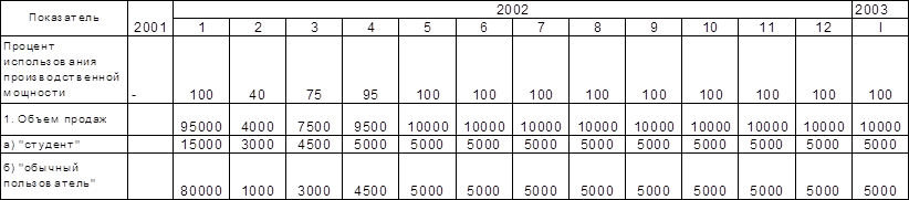 Предполагаемый объем продаж и коэффициент использования производственной мощности представлен в таблице 7. Как уже отмечалось выше в первый месяц деятельности фирмы будет проведена рекламная акция в процесе которой, все желающие смогут бесплатно пользоваться интернетом в течение месяца; всвязи с этим предполагается что в этот период производственная мощность достигнет 100%.