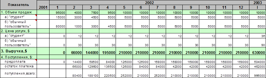 Комментарии : предполагается, что после 6-го месяца 80% пользователей будут работать по предоплате, т.к. абоненты хотят быть уверены, что будут обеспечены услугой на будущее время и поэтому они платят заранее, занимая тем самым себе места.