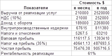 Расчет прибыли и рентабельности осуществлен исходя из прогнозируемых объемов производства, прогнозируемых цен на услуги, внутренних издержек фирмы на производственную программу при полной загрузке мощности.