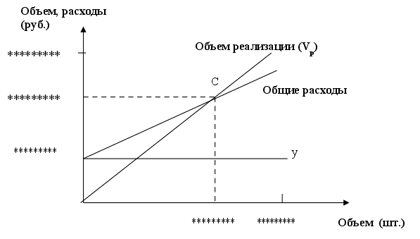 На графике можно выделить две зоны, образованные пересечением прямых объема реализации и общих расходов: зону убытков и прибыльности. Точка пересечения этих прямых (на рисунке это точка С) и есть точка безубыточности. Она показывает минимальный объем продаж (как в натуральном, так в стоимостном выражении), при котором достигается безубыточность предприятия. Дальнейшее увеличение объема производства ведет к появлению и увеличению прибыли.