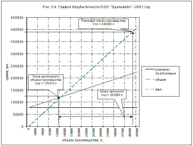 Критический объем производства = сумма условно-постоянных затрат : (цена на ед. продукции – ( сумма условно-переменных затрат: объем производства)) = 77566 : ( 0,78 – (146227 : 430000) ) = 176315 л.