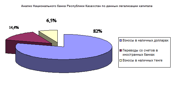 Из них половина легализованных средств поступила на спец.счета в последние три дня легализации, которым, кстати, предшествовали суровая по тону главы государства встреча с казахстанскими предпринимателями и героическое самопожертвование министра государственных доходов Зейнуллы КАКИМЖАНОВА, публично покаявшегося в предпринимательских грехах. После этих мероприятий стало ясно, что концовка легализации будет ударной. За один день 13 июля в банки было сдано средств на 20 млрд. тенге (примерно 140 млн. долларов), то есть годовой оборонный бюджет Казахстана! Более 82% легализованных денег поступило наличными долларами, 11,4% были переведены из-за рубежа, а 6,5% сдали в наличных тенге. (см. Приложение 1).