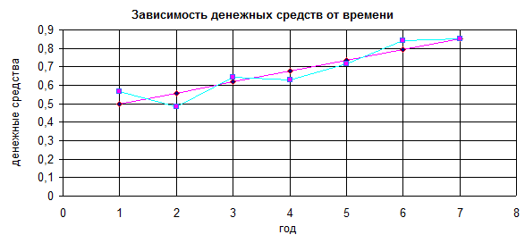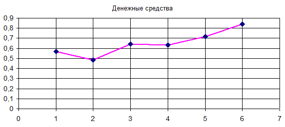 При подстановке в данное уравнение значение t =7, получаем прогнозное значение показателя “денежные средства” на седьмой год: 0,8535.