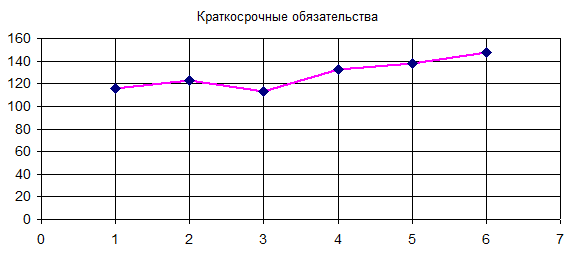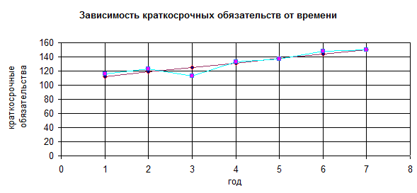 При подстановке в данное уравнение значение t =7, получаем прогнозное значение показателя “краткосрочные обязательства” на седьмой год: 150,475.