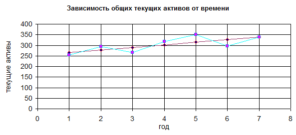 При подстановке в данное уравнение значение t =7, получаем прогнозное значение показателя “общие текущие активы” на седьмой год: 338,585.