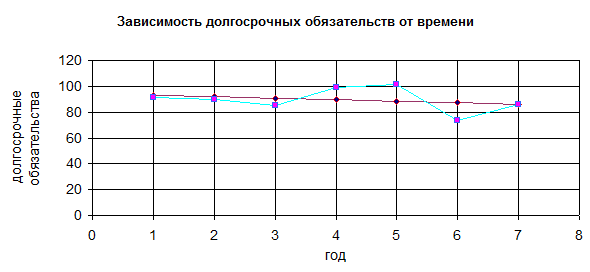 При подстановке в данное уравнение значение t =7, получаем прогнозное значение показателя “долгосрочные обязательства” на седьмой год: 86,116.