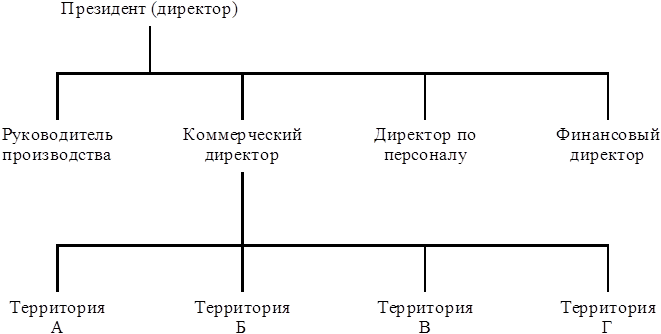 Примечание. В дан ном случае функция сбыта осуществляется по географическому признаку, но может быть организована и по признаку выпускаемой продукции или в соответствии с запросами потребителей. Это зависит от того, какому фактору мы отдаем предпочтение.