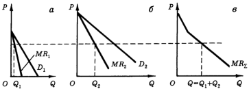 Следовательно, кривая предельной выручки монополиста представляет собой горизонтальную сумму кривых предельной выручки обоих секторов рынка (рис. 2,в ). Заметим, ход приведенных выше рассуждений полностью аналогичен ходу рассуждений, с помощью которых мы показали, что монополист, осуществляющий выпуск продукции на нескольких заводах, всегда распределяет свой объем производства между этими заводами так, что предельные затраты по выпуску продукции на всех заводах равны между собой.