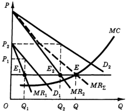 Осуществляющий ценовую дискриминацию монополист распределяет объем реализации между сегментами рынка так, что MR 1 = MR 2 . Следовательно,