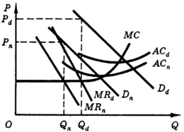 Обратимся к графическому анализу ценообразования по пиковой нагрузке (англ . реасk-lоаd pricing), представленному на рис. 4. Условно примем, что все электростанции разделены на две группы: первая группа работает непрерывно; вторая группа работает только в часы совмещенного максимума. Линии АС n и АС d отражают соответственно средние затраты на производство "ночной" (первая группа станций) и "дневной" (вторая группа) электроэнергии, т. е. производимой дополнительно в часы совмещенного максимума. Линии МС n и МС d , предельные затраты на производство дневной и ночной энергии, совпадают (МС ). Соответственно линии D n и D d отражают "ночной" (постоянный в течение суток) и "дневной" (дополнительный в часы совмещенного максимума) спрос на электроэнергию. Объем производства "ночной" (Q n ) и "дневной" (Q d ) электроэнергии определяется точками пересечения соответствующих линий предельной выручки МR n и MR d линией предельных затрат (МС ). Следовательно, цены "ночной" и "дневной" электроэнергии Р n и P d максимизируют прибыль.