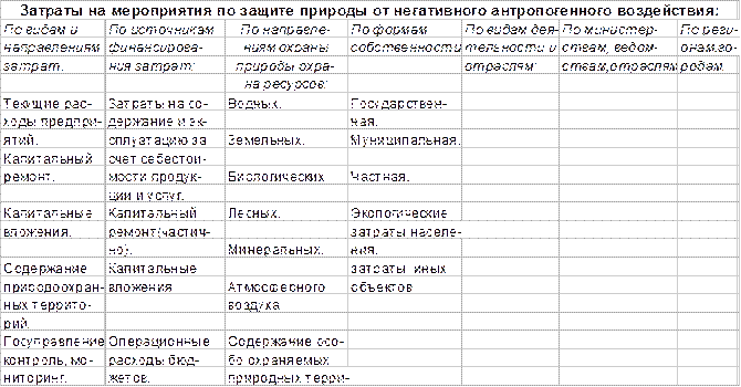Причем подобная неопределенность распространяется не только на отдельные мероприятия (например, вывод вредных производств за пределы населенных пунктов), но и на целевые виды деятельности( многие элементы водохозяйственного строительства и мелиорации и т.д.). Не останавливаясь подробно на аналитическом разборе предложений по упорядочению и совершенствованию учета экологических затрат, можно отметить, что наиболее логически стройной представляется точка зрения, согласно которой к охране окружающей природной среды относится ограниченный круг мероприятий по сохранению ее качества, защите различных природных ресурсов о негативных антропогенных воздействий. Сюда должны включаться как целевая деятельность по охране природы, так и сопряженные мероприятия по внедрению прогрессивных технологий производства и форм потребления.