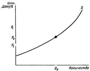 Кривая предложения S показывает, какое количество товара и по какой цене производителя могут продать на рынке. Кривая поднимается вверх, потому что, чем выше цена, тем большее число фирм имеет возможность производить и продавать товар. Например, более высокая цена дает возможность существующим фирмам расширить объем производства в короткий промежуток времени за счет привлечения дополнительной рабочей силы или сверхурочных работ, а в длительный промежуток времени — за счет экстенсивного развития самого производства. Более высокая цена может также привлечь на рынок новые фирмы, у которых еще высоки издержки производства и продукция которых при низких ценах является нерентабельной.