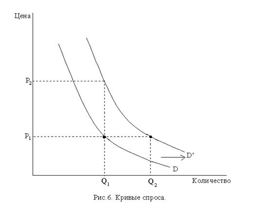 При большем доходе потребители могут расходовать больше денег на покупку товара. Если бы рыночная цена оставалась постоянной – P1 , можно было бы ожидать роста потребляемого количества (с Q1 до Q2 ). Это произойдет независимо от того, какова рыночная цена, а поэтому итогом будет сдвиг кривой опросов вправо. На рис.6 это отражено как сдвиг от D к D`. В качестве альтернативы мы можем задать такой вопрос: какую цену потребители заплатят, чтобы приобрести определенное количество товара Q1 ? При большем реальном доходе они будут готовы уплатить более высокую цену, скажем P2 вместо P1 на рис. 6. Снова кривая спроса сместится вправо.