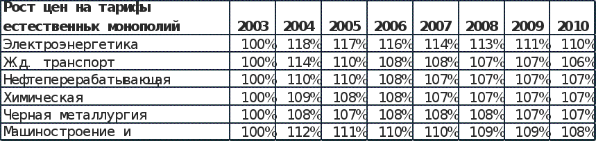| Рост цен на тарифы естественных монополий | 2003 | 2004 | 2005 | 2006 | 2007 | 2008 | 2009 | 2010 | |