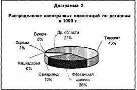 В первые годы после обретения независимости инвестиционная активность резко снизилась из-за нестабильной нормативно-правовой базы, быстрой инфляции, спада производства и жесткой, налоговой политики. Однако в результате формирования стратегии экономических реформ, создания полноценной правовой и финансовой системы начиная со второй половины 1995 г. наметилось заметное возрастание объемов капитальных вложений. В 1999 г. их общий объем достиг 503215 млрд. сумов, то есть увеличился по сравнению с предыдущим годом в 1,3 раза. Более 2/3 совокупных инвестиций освоено в производственной сфере. Из них на приобретение оборудования и современных технологий направлено более 30%. Объем иностранных инвестиций в 1999 г, составил более 23332 млрд. сумов, хотя их доля по сравнению с предыдущим годом несколько уменьшилась (на 2,9%).