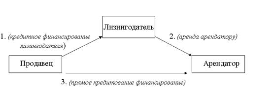 Общая схема сравнения может выглядеть следующим образом. Прямое кредитное финансирование сравнимо с лизинговым финансированием. Однако, два вида финансирования различны по своей структуре. Лизинговая операция состоит из двух этапов: приобретения лизингодателем предполагаемых к сдаче в аренду активов (1 этап) и непосредственно аренды актива (2 этап). Прямое кредитное финансирование приобретения активов не предполагает наличие финансового посредника и осуществляется в один этап. Таким образом, в сравнительном анализе необходимо рассмотреть как минимум 3 взаимосвязи, из которых первые две соответствуют лизинговому финансированию, а третья - прямому кредитованию. При этом общая схема анализа упрощается в том смысле, что продавец лизингового имущества рассматривается одновременно и как кредитор (см. рис. II.1).