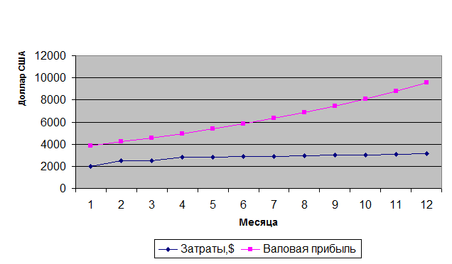 Затраты фирмы по отношению к доходам на первый месяц составят 23% или 23 копейки с каждого рубля. Затраты фирмы по отношению к доходам к концу года будут равны 17% или 17 копеек с каждого рубля. Рассчитанные выше коэффициенты прибыльности доказывают выгодность вложения капитала в данную фирму.