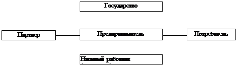 Основным субъектом предпринимательской активности выступает предприниматель. Однако предприниматель — не единственный субъект, в любом случае он вынужден взаимодействовать с потребителем как основным его контрагентом, а также с государством, которое в различных ситуациях может выступать в качестве помощника или противника. И потребитель и государство также относятся к категории субъектов предпринимательской активности, как и наемный работник (если, конечно, предприниматель работает не в одиночку), и партнеры по бизнесу (если производство не носит изолированного от общественных связей характера) (рис. 1).