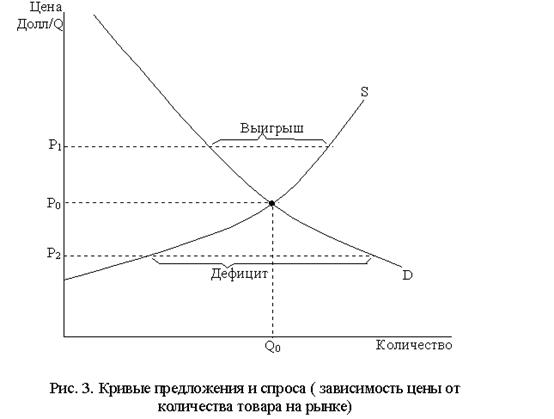 Начнем с краткого рассмотрения основной диаграммы “предложение - спрос”, показанной на рис.3 . На оси ординат обозначена цена единицы товара P в долларах. Это цена, которую продавец получает за определенное предлагаемое количество товара и которую покупатель заплатит за определенное требуемое количество этого товара. Ось ординат показывает общее требуемое и предлагаемое количество товара Q в данный период времени.