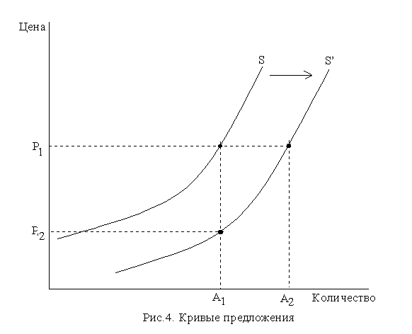 Начнем с кривой предложения S на рис.4. Она показывает, какой объем товара производители готовы продать в зависимости от цены на рынке. Например, при цене Р1 производимое и реализуемое количество продукции будет равно Q1. Теперь предположим, что стоимость сырья снизилась. Как это повлияет на предложение ?