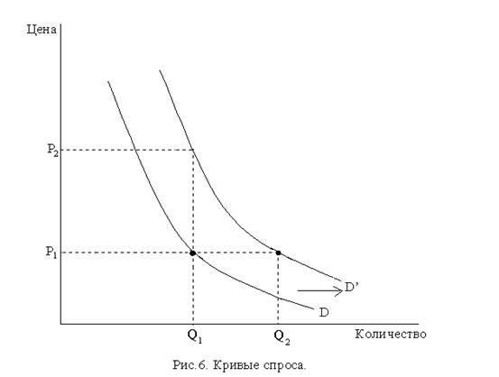 При большем доходе потребители могут расходовать больше денег на покупку товара. Если бы рыночная цена оставалась постоянной - Р1 , можно было бы ожидать роста потребляемого количества (с Q1 до Q2) . Это произойдет независимо от того, какова рыночная цена, а поэтому итогом будет сдвиг кривой спросов вправо. На рис.6 это отражено как сдвиг от D к D’. В качестве альтернативы мы можем задать такой вопрос: какую цену потребители заплатят, чтобы приобрести определенное количество товара Q1 ?При большем реальном доходе они будут готовы уплатить более высокую цену, скажем P2вместо Р1 на рис.6. Снова кривая спроса сместится вправо.