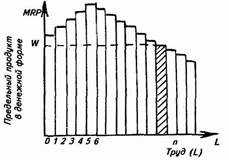 Допустим, что цена единицы выпускаемой продукции составляет 2 долл., а сложившийся уровень заработной платы в данной отрасли — 600 долл. Тогда (в условиях совершенной конкуренции на рынке труда) только при найме 4-го работника будет соблюдаться правило: MRP = W, т. е. в нашем примере MRP равен 600 долл. (300x2 долл.), что и соответствует величине заработной платы 600 долл.