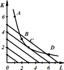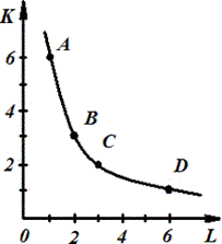 Любое сочетание факторов производства, например, 6К и 1L, 3К и 2L, 2К и ЗL, 1К и 6L обеспечит одинаковый физический объем продукции. Но какое сочетание будет самым дешевым для предпринимателя? Учитывая данные этой таблицы, на рис. 2 построим кривую равного продукта , или кривую безразличия производства (изокванту ). Все точки этой кривой А, В, С, Д показывают различное сочетание факторов производства для выпуска 100 единиц продукции.