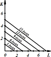 На рис. 3 построим линии равных издержек, т. е. соединим точки на оси абсцисс и оси ординат, в которых затраты на факторы производства будут равными. Эти линии называются изокосты ; они являются линиями бюджетного ограничения для предпринимателя.