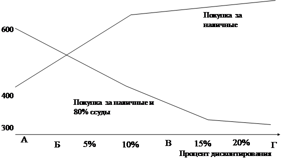 Как видим, на промежутке АБ наименьшие затраты будут при покупке оборудования за наличные деньги; на промежутке БВ выгоднее купить оборудование с использованием ссуды, а на промежутке ВГ разумнее прибегнуть к финансированию с помощью лизинга [2].