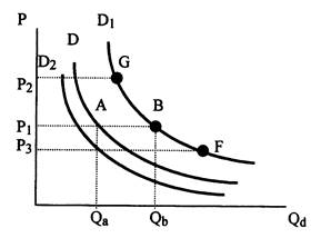 В случае изменения факторов, влияющих на величину Qd , могут меняться взаимоотношения между Qd и Р. Пусть по цене Р1 домохозяйства приобретают некий товар в количестве Qа единиц (точка А кривой D). При возросшем доходе домохозяйства имеют возможность купить по цене Р1 уже больше товара (Qb ). Можно полагать, что и по цене Р2 , и по цене Р3 они станут приобретать большее количество товара. В этом случае говорят о сдвиге кривой вправо (кривая D1 ). Если под влиянием изменения какого-то фактора происходит снижение Qd , то кривая спроса сместится влево (кривая D2 ). Спрос на товар представлен всей кривой спроса. Сдвиг ее вправо отражает увеличение спроса, сдвиг влево — уменьшение спроса.